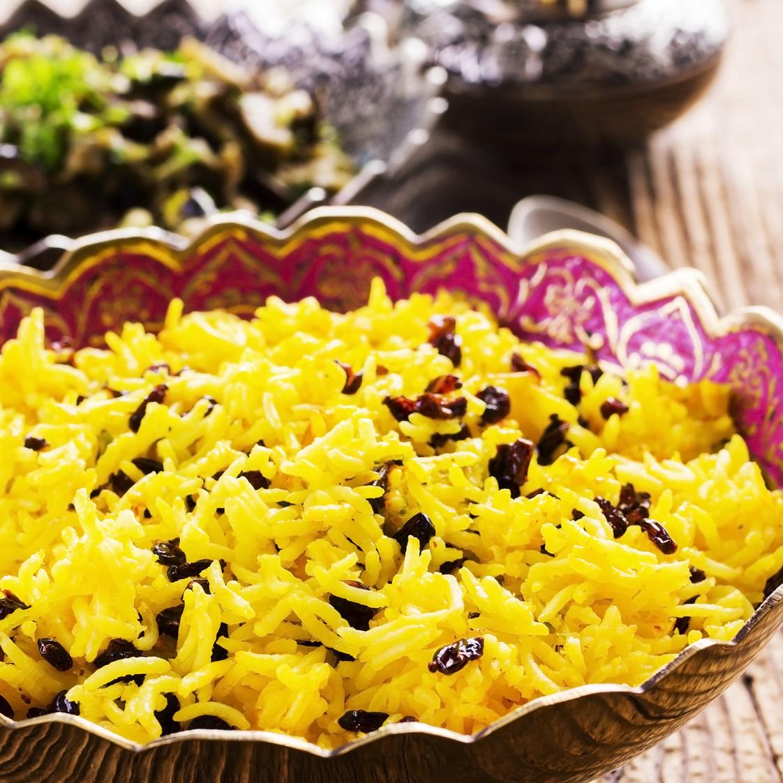 Trotz vieler trockenen und unwegsamen Gebiete gibt es zirka zehn Prozent landwirtschaftliche Nutzfläche. Am häufigsten werden im Iran Weizen, Reis, Zuckerrohr, Pistazien, diverse Nüsse, Datteln und Wein für Rosinen angebaut. Informationen und Rezepte zur Küche im Iran findet man meistens unter der Bezeichnung persische Küche. Geschmacksharmonie, Aromen, Düfte, darum geht es in der persischen Küche. Mit Sorgfalt wird gewürzt und abgeschmeckt, dafür gibt es unendlich viele Gewürze und Zutaten. Für Reisgerichte verwendet man am liebsten Duftreis, der in den meisten Fällen noch mit Kräutern oder Samen aromatisiert wird. Die am häufigsten verwendeten Gewürze sind Kurkuma (Gelbwurzel) und Safran. Die Säure und Süße der Gerichte wird oft mit Orangen, Limetten und Granatapfelkernen ausbalanciert.