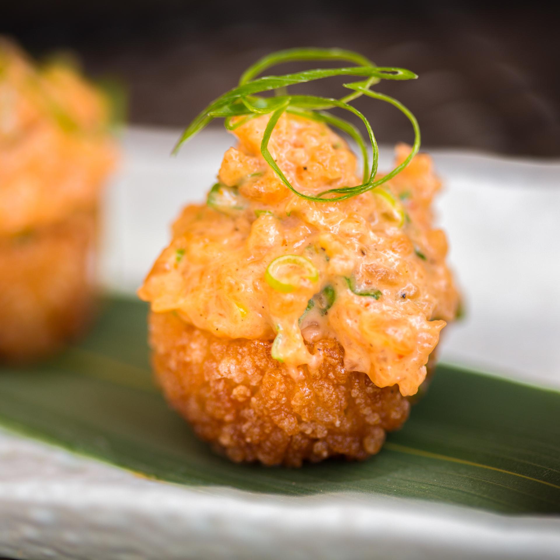 Das Tempurateigmehl mit dem Eiswasser zu einem zähflüssigen Teig verrühren und die Sesamsamen untermischen. Das Öl in einem großen Topf oder in der Fritteuse auf 180°C erhitzen.