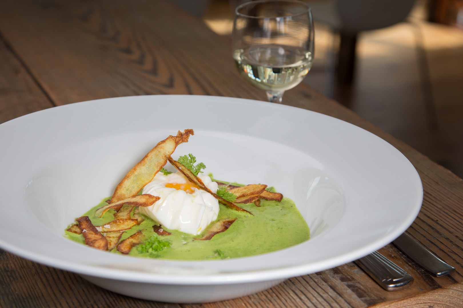 Inzwischen Spinat und Kerbel putzen und waschen. Spinat, Kerbel und Butter nach und nach in die heiße Suppe geben und mit dem Standmixer zu einer glatten Flüssigkeit pürieren. Anschließend auf höchster Stufe schaumig aufschlagen. Suppe kräftig mit Salz, Pfeffer, Muskat und einem Spritzer Limettensaft abschmecken und in tiefe Teller geben. Onsenei und Kartoffelknusper draufgeben und mit ein wenig frischem Kerbel dekorieren.